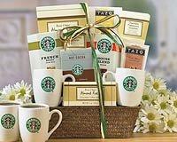 A collection of some of Starbucks most popular items fills this lovely basket. Light and flavorful House Blend and dark smoky French Roast coffee are nestled alongside Brown & Haley buttercrunch toffee cookies, caramel nut cluster, peppermint chocolate, toffee wafers, Starbucks hot cocoa, Tazo black, green and herbal teas and two Starbucks signature coffee mugs. You will not find this exclusive gift available anywhere else. Gift Size: 12" x 8" x 10" - Item 613